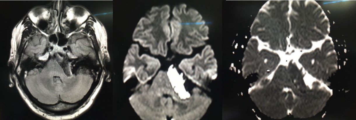 Explaination: Epidermoids are often indistinguishable fromarachnoid cystsor dilated CSF spaces on many MR sequences, except for DWI/ADC which helps to differentiate them<br>T1 usually isointense to CSF<br>T1 C+(Gd) thin enhancement around the periphery may sometimes be seen<br>T2 usually isointense to CSF (65%)<br>FLAIR often heterogeneousdirty signal higher than CSF<br>DWI/ADC: very bright on DWI<br>- similar ADC values compared to adjacent brain parenchyma<br>- useful for differentiation from arachnoid cysts due to increased signal (due to a combination of abnormal restricted diffusion andT2 shine through), which is not seen with arachnoid cysts