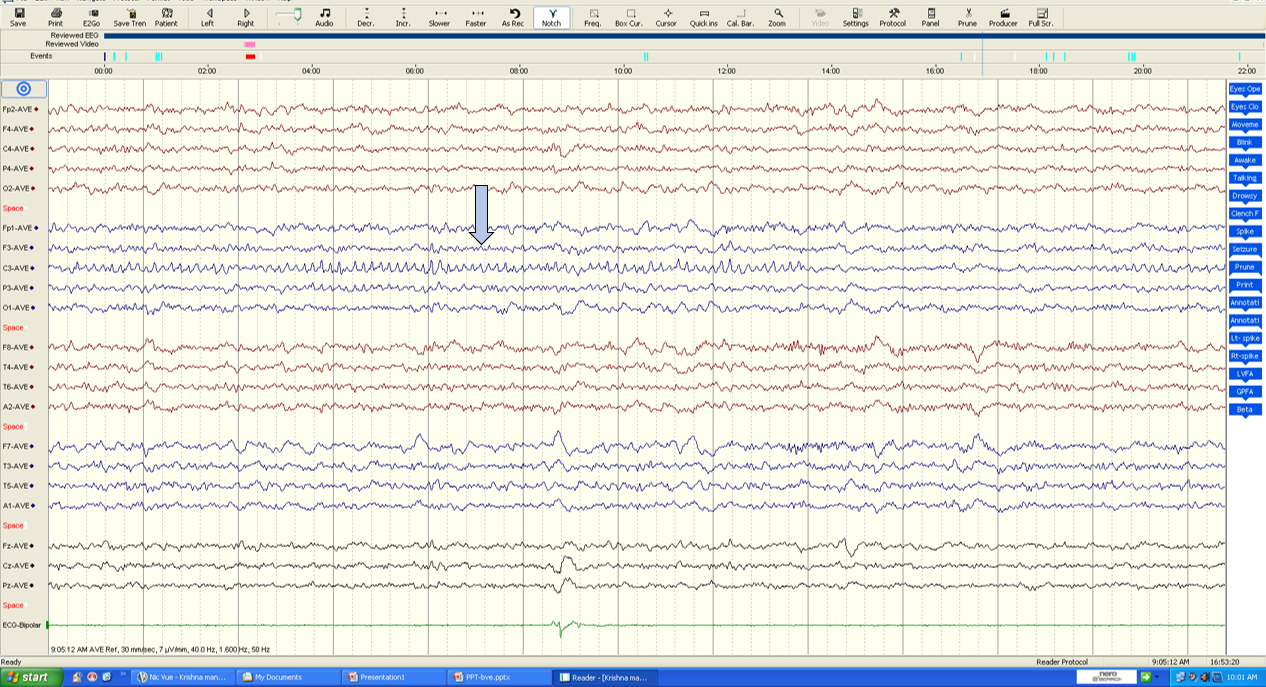 Explaination: Mu rhythm is normal variant<br>Found over the motor strip (C3/C4)<br>Sometimes more evident during drowsiness and when the eyes are open<br>Attenuates with movement of the opposite upper limb (e.g., making a fist), or even thinking about such an action<br>It is often prominent over the site of a craniotomy<br>Similar rhythms located in the temporal regions are called wicket rhythms