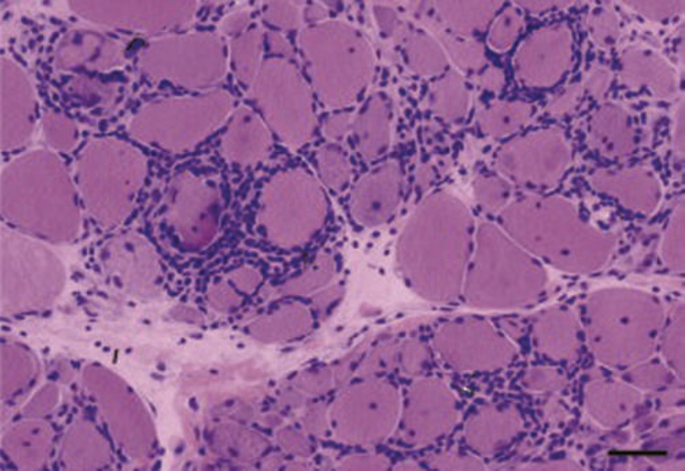 Explaination: The image demonstrates endomysial lymphocyte infiltration indicative of polymyositis. This pattern is in contrast to dermatomyositis, where biopsy shows perifascicular inflammatory infiltrate only. Emery Dreifuss muscular dystrophy is an X-linked disease that tends to affect boys between the ages of 5 and 15, with no inflammatory pathological findings, but with dystrophic features, including wide variation in fiber size and increased fibrous and adipose tissues. Inclusion body myositis is an inflammatory myopathy, with pathology showing vacuoles with basophilic granules