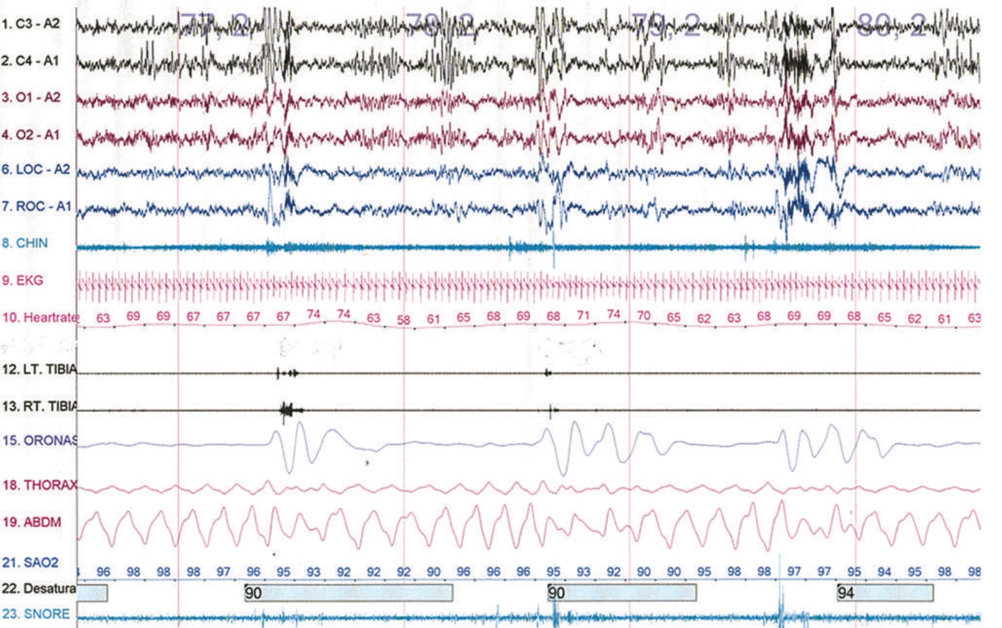Question: The figure below shows a 120-second segment from an overnight polysomnogram. Which of the following is demonstrated in the picture?