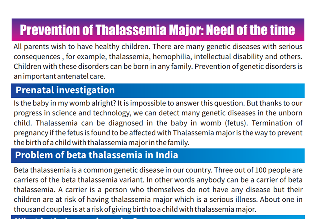 Awareness booklet on preventing thalassemia through carrier screening and prenatal testing.